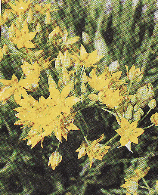 Cibuľovitá trvalka s kopijovitými, sivozelenými, do 20 – 30 cm dlhými, prízemnými, obyčajne párovito usporiadanými listami. V lete vytvára husté okolíky s priemerom 5 cm, v ktorých býva do 30 hviezdovitých, žiarivo zlatožltých kvetov. Rýchle sa rozmnožuje a má ideálne predpoklady zdomácňovať vo svetlých lesoch alebo v krovinách.