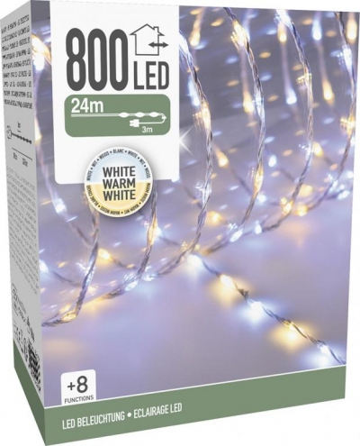 LED svetelná reťaz je kombináciou 2 farieb v jednom výrobku, super hustá 800 LED žiarovková svetelná reťaz s priesvitným káblom. Je vhodná na interiérové aj exteriérové použitie. v kombinácii teplej čírej farby. Dĺžka prívodného kábla je 3 m. Dĺžka reťaze je 24 m. Balenie obsahuje prívodný kábel a adaptér. Rozostup žiaroviek je 3 cm. Veľkosť žiaroviek je 5 mm.