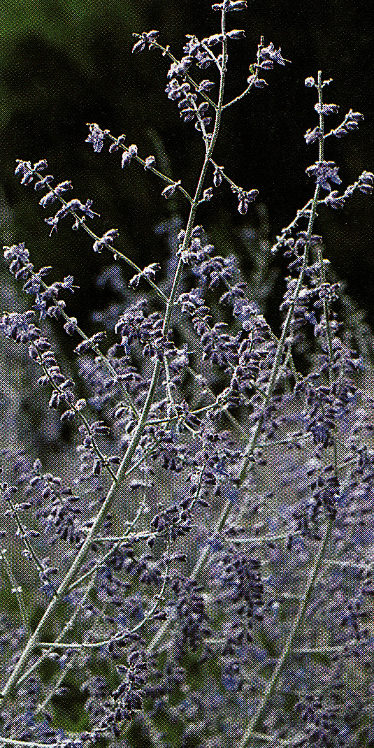Vzpriamený poloker so sivobielymi výhonkami a vajcovitými, hlboko strihanými a laločnatými, sivozelenými, do 5 cm dlhými listami. Koncom leta a začiatkom jesene vyrastajú vo vysokých, až 30 cm dlhých metlinách malé, rúrkovité, fialovomodré kvety.